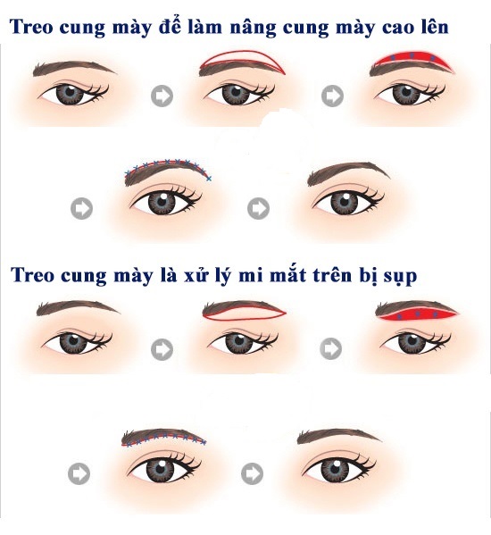 Bác sĩ sẽ dùng đường rạch khoảng 1cm ở vùng chân tóc trên cung mày, dùng nội soi bóc tách xuống cung mày và treo cao nó lên. Nhờ vậy, vết sẹo kín đáo vùng chân tóc ở trán chứ không có sẹo vùng cung mày. Kĩ thuật mổ nội soi treo cung mày có thể thực hiện trên những cung mày không xâm.