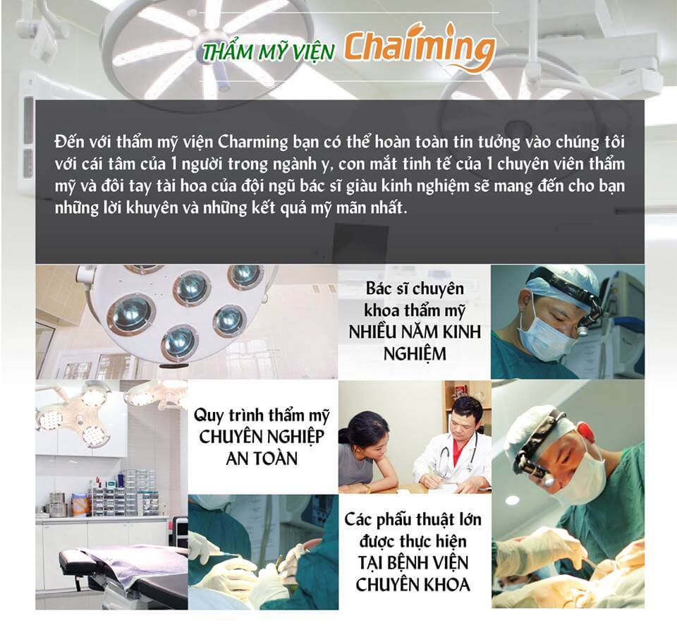 Đội ngũ bác sĩ tận tâm, giỏi chuyên môn, đặc biệt là bác sĩ Nguyễn Khanh, bác sĩ chuyên khoa nhiều năm kinh nghiệm trong lĩnh vực phẫu thuật thẩm mỹ tạo hình, cơ sở vật chất, công nghệ được đầu tư hiện đại, tối tân… Sau khi nâng mũi tại Thẩm Mỹ Viện Charming bạn sẽ sở hữu chiếc mũi ưng ý, dáng mũi đẹp tự nhiên, không bị bóng đỏ, hài hoà với khuôn mặt.