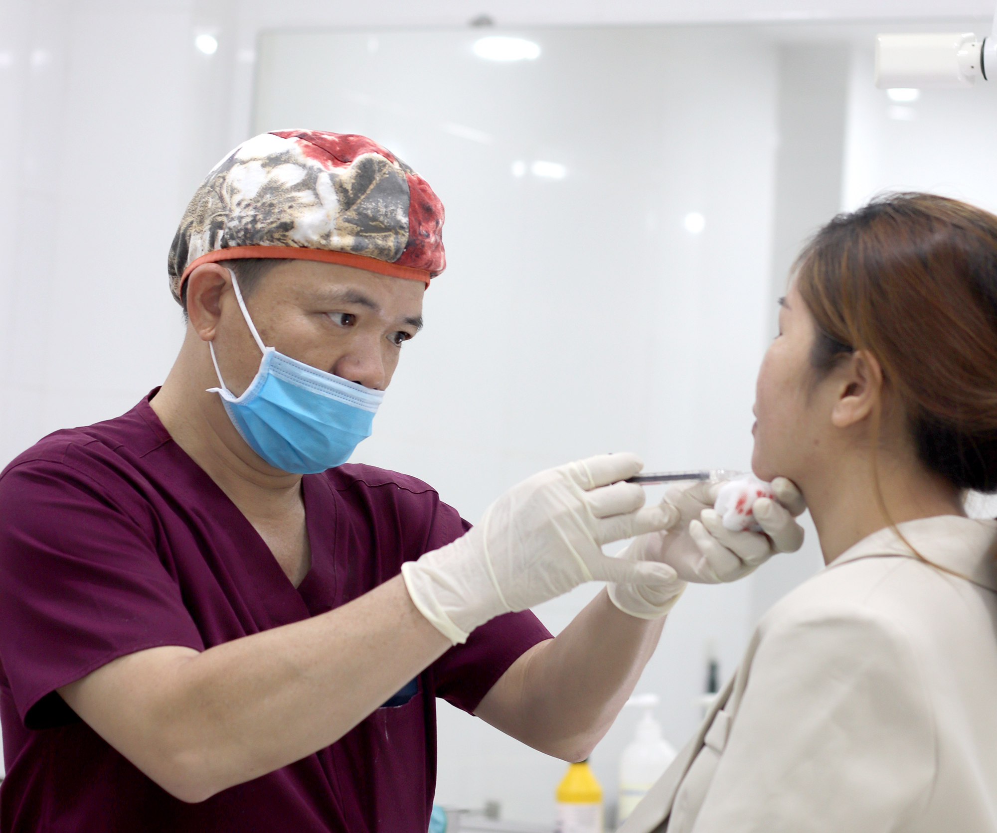 Hình ảnh Bs Nguyễn Khanh thực hiện tiêm filler cằm cho nàng khách tại TMV Charming
