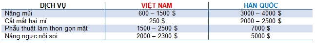 Đây là bảng giá tham khảo của một thẩm mỹ viện tại Hàn Quốc – một mức chi phí không hề thấp. Tuy nhiên chỉ riêng ở thủ đô Seoul, cũng đã có tới 4000 trung tâm thẩm mỹ và mức giá cũng dao động rất khác nhau. Chưa kể, bạn còn phải chuẩn bị chi phí vé máy bay, chi phí ăn ở,thuê phiên dịch, chi phí nằm và chăm sóc trong bệnh viện.