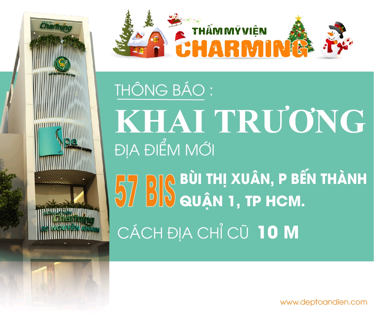 Để đáp ứng mục tiêu phát triển và mở rộng môi trường làm việc chuyên nghiệp nhằm phục vụ quí khách hàng tốt hơn, kể từ ngày 15/12/2013 Thẩm mỹ viện Charming sẽ chuyển từ địa chỉ cũ : 49 Bùi Thị Xuân, P Bến Thành, Quận 1, Tp HCM đến địa chỉ mới 57 Bis Bùi Thị Xuân, P Bến Thành, Quận 1, Tp HCM ( Cách địa chỉ cũ 10m)