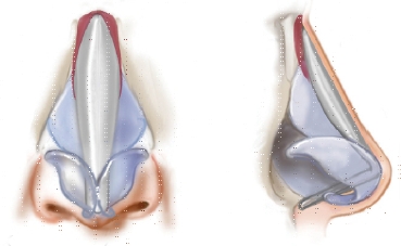 Còn vùng phía trên có một phần là sụn và phần còn lại là xương chính mũi cứng hơn nên được thay thế bằng chất liệu cứng hơn như chất liệu nhân tạo, chất liệu sinh học.